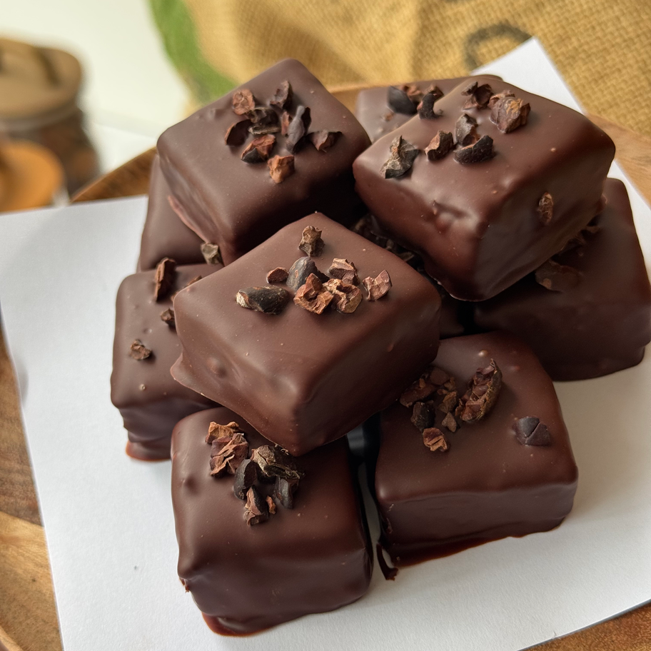 Ripe bananas are slowly cooked down into a rich, velvety sweet, then coated in our 65% dark chocolate and finished with a sprinkle of roasted cacao nibs for added crunch.