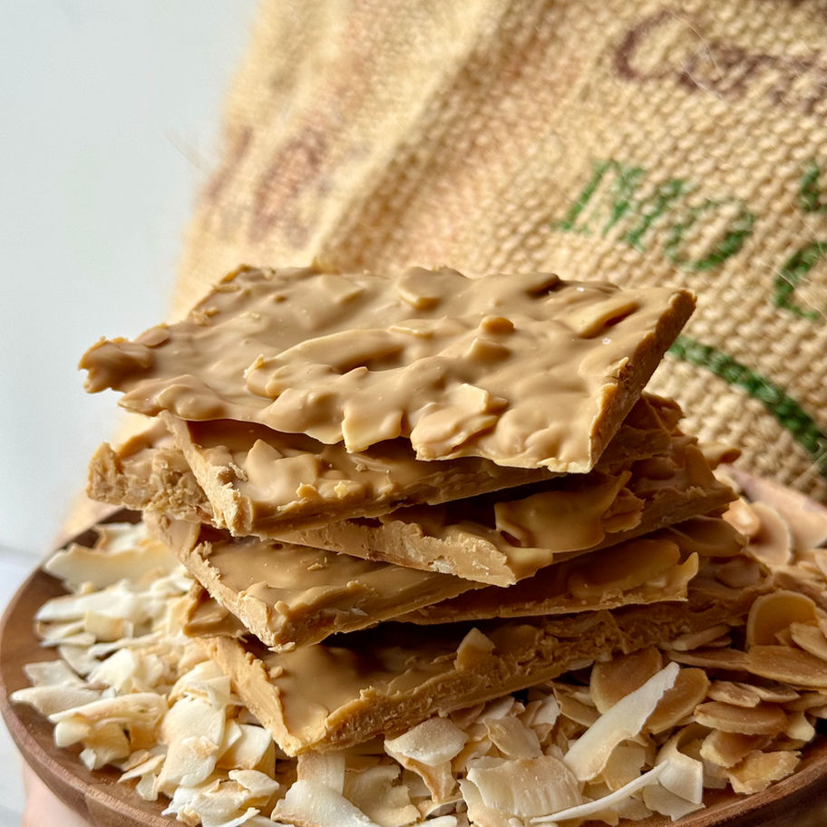Delicately thin shards of caramelised blonde chocolate blended with toasted coconut and toasted almonds, finished with a touch of sea salt for the perfect balance of sweetness and savoury depth.